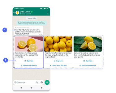 Carousel templates allow you to send a single text message (1), accompanied by a set of up to 10 carousel cards (2) in a horizontally scrollable view.