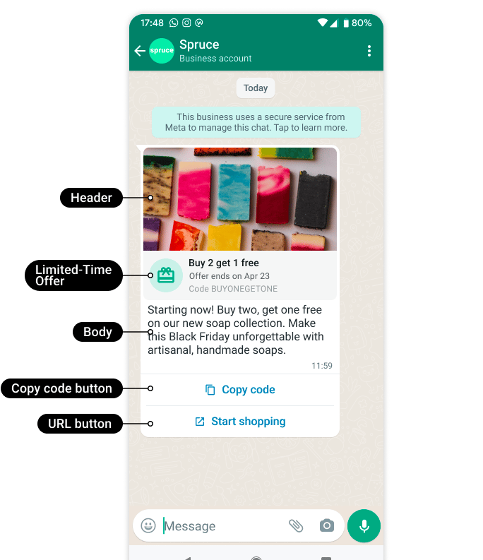 Display expiration dates and running countdown timers for offer codes in template messages, making it easy for you to communicate time-bound offers and drive customer engagement